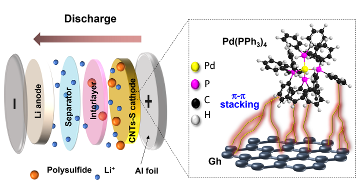 杨植教授团队开发了一种四(三苯基膦)钯(TPP)催化剂修饰石墨烯(Gh)的插层膜,应用于Li−S电池正极结构中。结合原位光谱、电化学表征和理论计算研究发现,在Li−S电池体系中,三苯基膦的解离打开了TPP 的盖子,为吸附/催化长链和短链多硫化锂提供了足够的空间和催化活性位点。此外,TPP中存在大量亲锂的P原子,可通过P−Li键促进Li+的传输。由于这种协同效应,含有Gh/TPP的锂硫正极在4.43 mg cm−2的高硫负载条件下,仍显示出优异的循环稳定性(在0.1 C下循环180 圈容量保持率为83.7%,面积容量为2.44 mAh cm−2)。这项工作架起了有机催化和电化学之间的桥梁。
