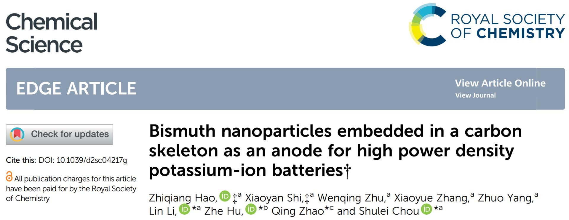碳中和技术创新研究院李林团队、深圳大学轷喆特聘教授和南开大学赵庆研究员合作在国际权威期刊Chemical Science上发表题为《Bismuth Nanoparticle Embedded in Carbon Skeleton as Anode for High Power Density Potassium-Ion Batteries》的学术论文。该工作以柠檬酸铋作为前驱体,通过简易的一步热解法成功将纳米级Bi颗粒均匀嵌入至碳骨架中,形成Bi@C复合材料。在10.0 A g−1的条件下,循环200次,Bi@C负极的可逆容量仍高达255.6 mAh g−1。结合实验表征和第一性原理计算,进一步探究了Bi@C复合材料在醚基电解液中具有快速电化学反应动力学的原因。另外,通过原位X射线衍射揭示了Bi@C复合材料在第一次和随后循环中的储钾机理的差异。最后,通过匹配镍基普鲁士蓝类似物(KNiHCF)正极材料构建了钾离子全电池,其功率密度超过10 kW kg−1,证明了Bi@C负极材料在功率型钾离子电池中的应用潜力。综上所述,该工作通过纳米结构工程、碳包覆和电解液优化等策略,成果实现了Bi负极材料对K+的快速储存,并通过与KNiHCF正极材料组合,成功构建了具有超高功率密度的钾离子全电池。金沙官网相关的文章发表在Chemical Science上,温州大学为第一通讯单位,金沙官网