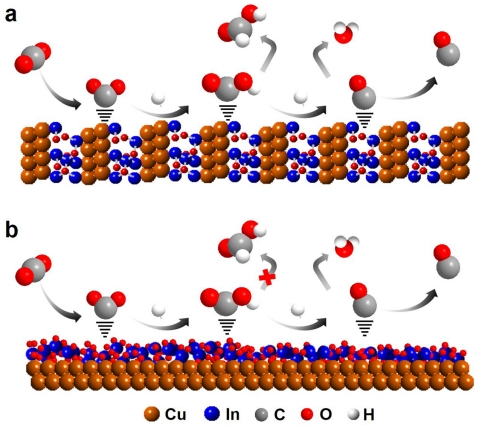 基于上述结果,提出了一种可能的机理:CO2分子吸附在Cu/In2O3 NPs/C表面时会与H+结合形成OCHO*中间体,然后以甲酸的形式解吸附。剩余的中间体将继续与H+偶联生成水,同时释放CO。然而,当异质结的Cu/In2O3 NPs/C转变为非晶态In2O3包覆的Cu核壳结构(Cu/In2O3 NPs/C-H2)后,电催化剂将由甲酸选择性转变为CO选择性。