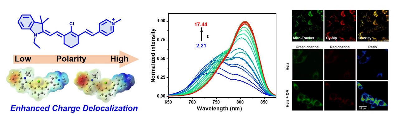 陈忠研博士在国际期刊《Analytical Chemistry》发表了题为“Rational Design of a Near-Infrared Ratiometric Probe with a Large Stokes Shift: Visualization of Polarity Abnormalities in Non-Alcoholic Fatty Liver Model Mice”的论文。该工作中,作者通过花菁对称性塌陷策略设计合成了一例近红外极性荧光探针Cy-Mp,实现了健康小鼠和NAFL小鼠的成像区分。理论计算结果表明,与传统花菁Cy7-Cl相比,Cy-Mp由局域激发向电荷转移激发转变,同时Cy-Mp分子的电荷排布受环境极性影响,可以灵敏响应环境极性的改变,实现对溶液极性的快速、灵敏比率检测,且测试结果不受粘度和生命体系中常见物质的干扰。
