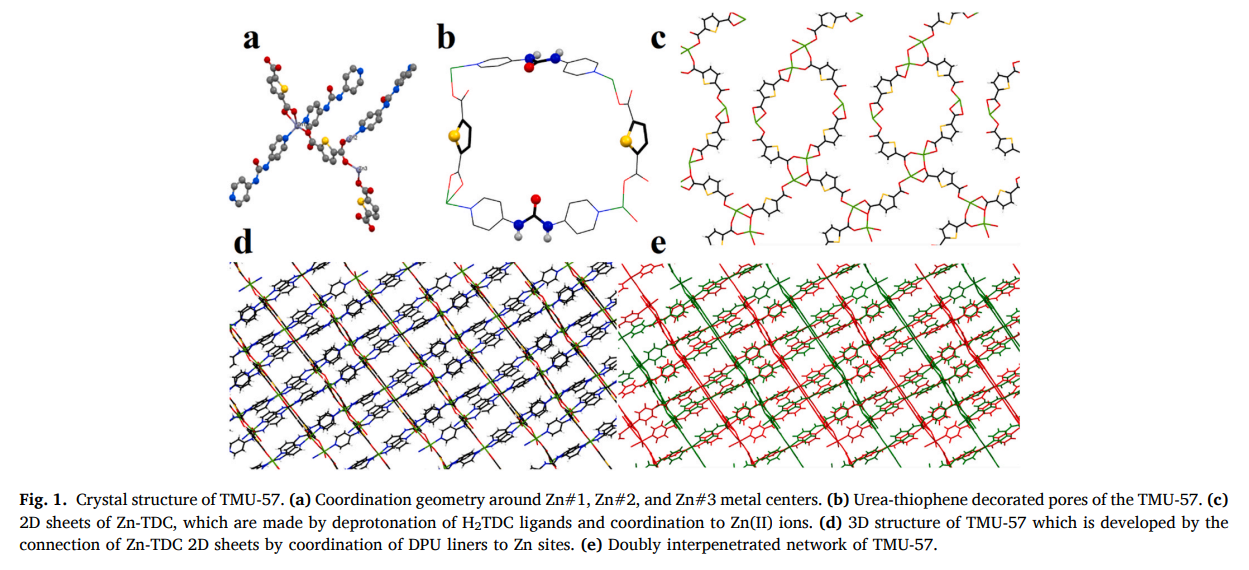 由于TMU-57经过富电子官能团噻吩和脲的修饰,它能够通过氢键以及路易斯酸-碱与不同的客体相互作用。TMU-57是对NACs最灵敏的传感器之一,特别是对2,4,6-三硝基苯酚(TNP),当TNP浓度为5 ppb时,对TNP的荧光淬灭率达92.5% (9),Ksv值为 2 (1) × 10+8 M−1,检测限达到9 × 10−9 M (k = 3, σ = 0.6),性能优于已报道的MOF材料。