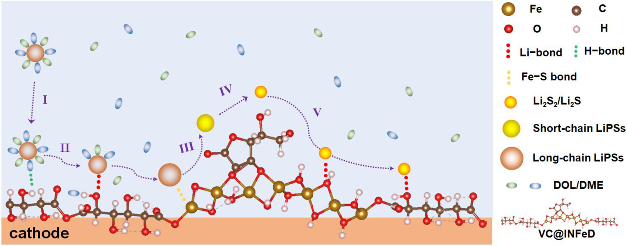 杨植教授、蔡冬博士联合杨硕博士开发了一种高效的VC@INFeD硫正极催化剂,在多重H/Li键的协助下,溶剂化的多硫化锂(LiPSs)在正极/电解质界面上可通过具有梯度吸附能力的羟基基团完成富集和脱溶化,随后在INFeD链上完成转移,进而在VC@INFeD级联催化位点实现其彻底转化。结果表明,INFeD主要促进长链LiPSs的转化,VC加速短链LiPSs的转化,两者协同可以显著降低每个硫氧化还原步骤的能量势垒,并赋予锂硫电池优异的电化学性能。即使在高硫含量(5.2 mg cm‒1)和贫电解质(E/S,~7μL mg−1)条件下,也具有高硫利用率和良好的循环稳定性。
