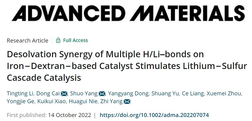 因此,本研究以 “Desolvation Synergy of Multiple H/Li–bonds on Iron−Dextran−based Catalyst Stimulates Lithium−Sulfur Cascade Catalysis”为题发表在材料领域顶级期刊《Advanced Materials》。温州大学作为第一通讯单位,2020级研究生李婷婷为第一作者,金沙官网