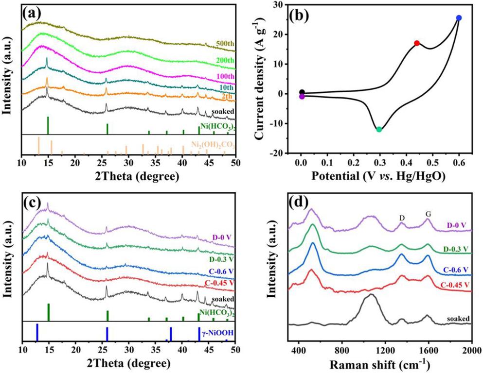 目前,对于金属碳酸盐化合物的储能机理尚不清楚,该工作通过对NiCo(HCO3)2的充放电过程进行了XRD与Raman的分析,结果证明了该材料的储能机理,如下所示: