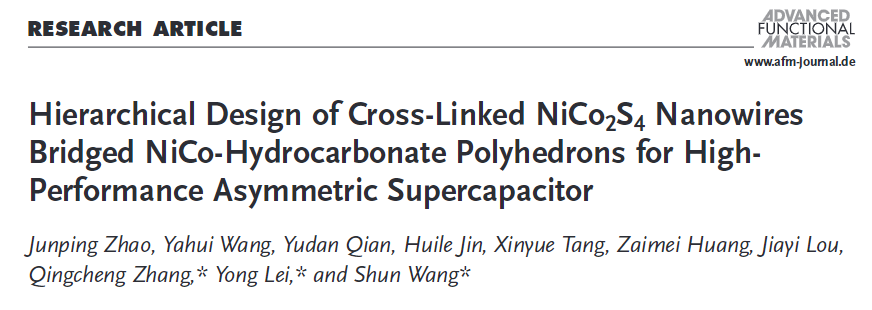 这一研究结果以“ Design of Cross-linked NiCo2S4 Nanowires Bridged NiCo-Hydrocarbonate Polyhedrons for High-Performance Asymmetric Supercapacitor” 为题发表在国际权威期刊《Advanced Functional Material》上,温州大学为第一通讯单位,金沙官网