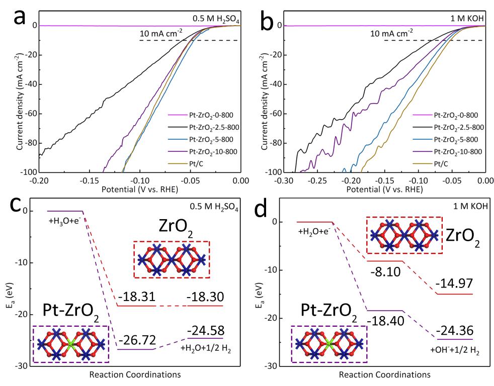 2、单质Pt(Pt-C)和金属氧化物负载的Pt(Pt-ZrO2)协同作用于HER。