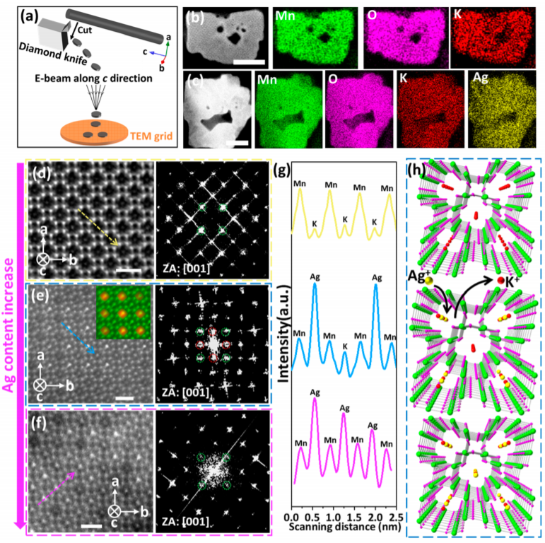2.发现一种可以调控的原子占位模式,例如,经过Ag+−K+交换后,当少量的Ag+进入二氧化锰晶格,Ag+排布具有周期性,而当大量的Ag+进入二氧化锰晶格,这种周期性被破坏。