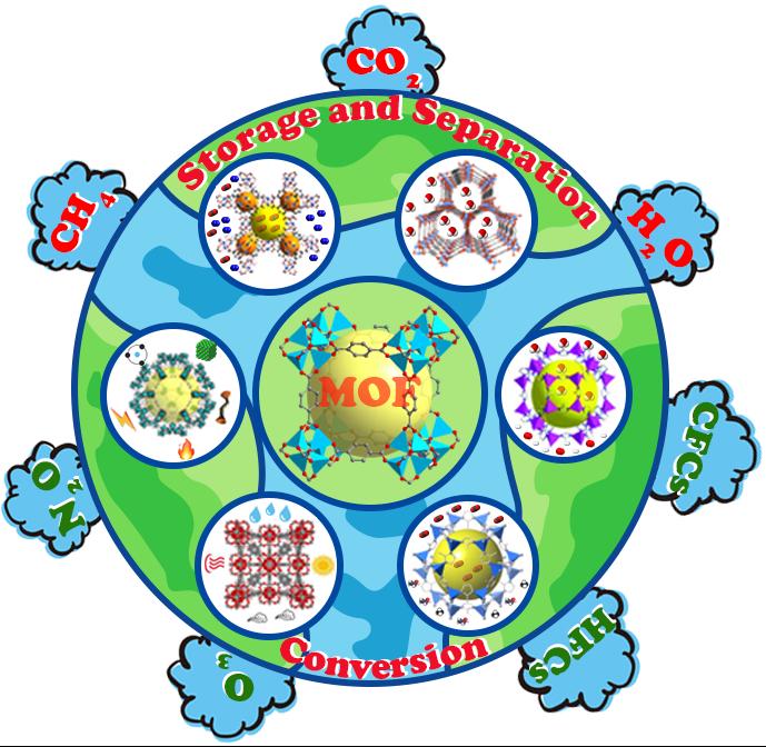 温室气体(Greenhouse Gas,GHG)是大气中能够吸收地面反射的长波辐射,并重新发射辐射的一些气体,主要包括二氧化碳(CO2)、水蒸气(H2O)、甲烷(CH4)、一氧化二氮(N2O)、臭氧(O3)、含氟气体(HFCs、CFCs)等。GHG的排放会带来显著的温室效应,使全球气温上升,威胁人类生存,因此有效地降低排放和减少大气中GHG的浓度是一项极其迫切的任务。另一方面,金属有机框架材料(Metal-Organic Frameworks,MOF)作为新型多孔材料的代表,因其具有高孔隙率,大比表面积,丰富纳米结构,可调物理化学性质等特点,被广泛地应用于GHG存储、分离、转化领域。