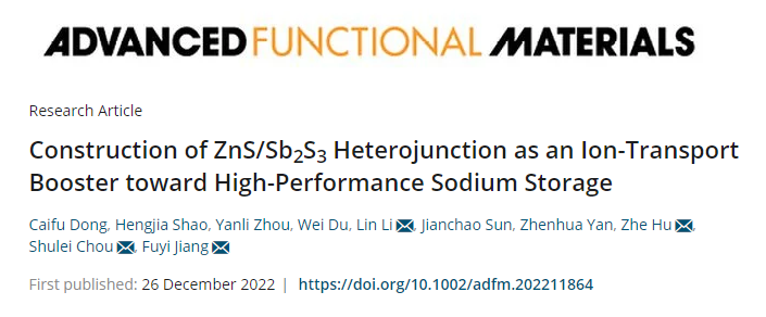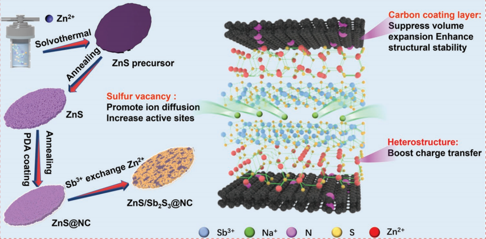 碳中和技术创新研究院李林团队联合烟台大学和深圳大学在国际权威期刊Advanced Functional Materials上发表题为《Construction of ZnS/Sb2S3 Heterojunction as an Ion-Transport Booster toward High-Performance Sodium Storage》的学术论文。该工作通过阳离子交换法将Sb2S3引入ZnS中,合成了氮掺杂碳包覆的ZnS/Sb2S3 (ZnS/Sb2S3@NC)异质结结构。理论计算和实验研究表明ZnS/Sb2S3@NC异质结结构的构建有效的提升了电荷转移速率。因此,ZnS/Sb2S3@NC表现出优异的循环稳定性(循环450圈后可逆容量为511.4 mAh g-1)和倍率性能(在10 A g-1电流密度下的可逆容量为400.4 mAh g-1)。此外,通过X射线衍射和高分辨率透射电镜深入研究了ZnS/Sb2S3@NC的储钠机理。最后,组装了ZnS/Sb2S3@NC//Na3V2(PO4)3/ rGO全电池,其在循环50圈后仍具有226.2 mAh g−1的可逆容量。金沙官网相关的文章发表在Advanced Functional Materials上,金沙官网