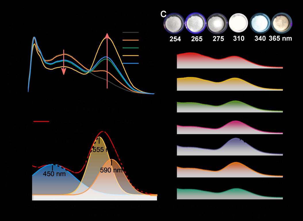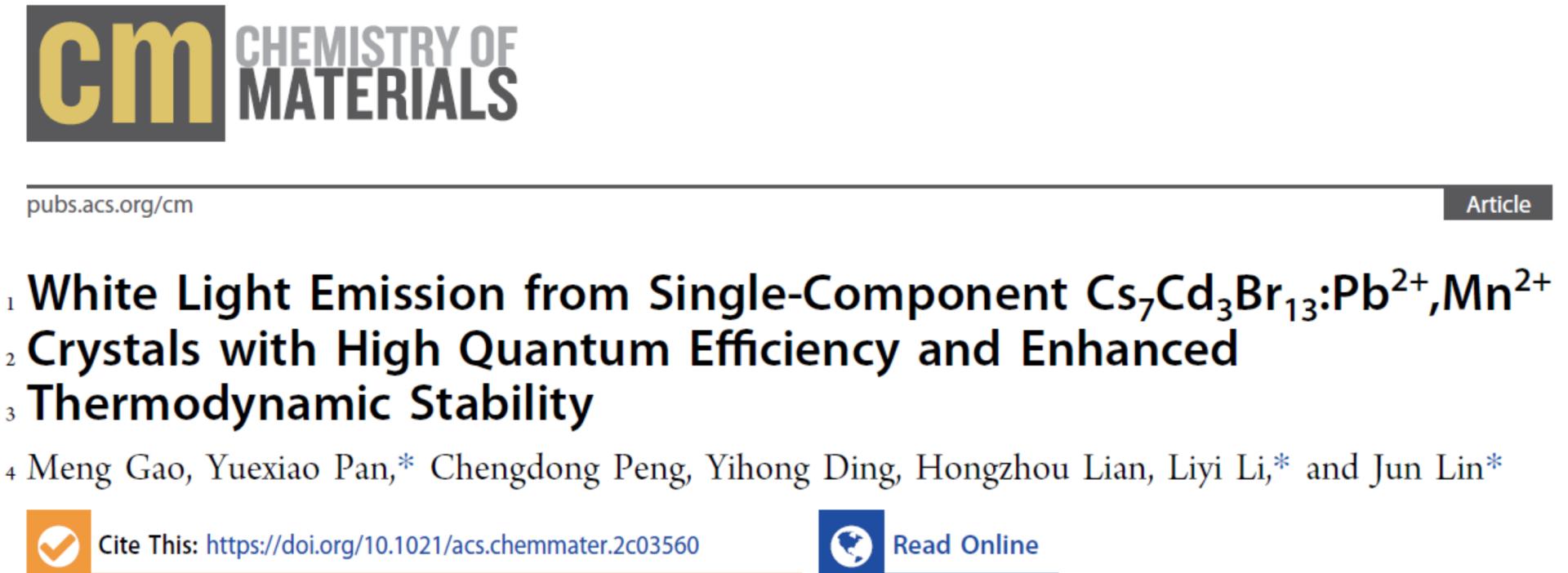 近日,温州大学潘跃晓课题组在国际著名刊物《Chemistry of Materials》上发表题为“White Light Emission from Single-component Cs7Cd3Br13:Pb2+,Mn2+ Crystals with High Quantum Efficiency and Enhanced Thermodynamic Stability”的论文,提出一种Pb2+/Mn2+共掺杂策略,在双格位晶体Cs7Cd3Br13中实现量子产率(PLQY)高达98%的双带可调谐白光发射。通过变温光谱、寿命衰减曲线等手段提供可靠证据证明其发光源自基质的STE1、Pb2+离子诱导的自由激子(FE)和STE2、Mn2+离子d-d跃迁的发射。通过理论计算与实验结果证实了Pb2+和Mn2+在双格位晶体Cs7Cd3Br13中优先占据孤立的[CdBr4]2-四面体而不是[CdBr6]4-八面体。这一发现为在单组分中产生多个发光中心获得单组分白光提供了一个新的视角,有助于阐明同一晶体中,掺杂剂在不结构单元的优先占位机制。