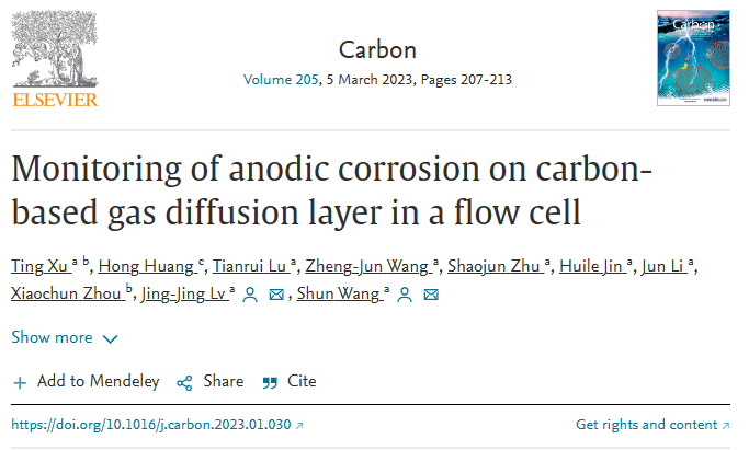 该成果以“Monitoring of anodic corrosion on carbon-based gas diffusion layer in a flow cell”为题发表在Carbon期刊(IF=11.307,JCR一区)上。温州大学为唯一通讯单位,金沙官网
