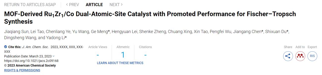 大学杜世萱教授以及清华大学李亚栋院士课题组合作合成了Ru1Zr1/Co DASC,该催化剂在200℃下表现出3.8×10-2 s-1的高翻转频率(TOF)和80.7%的C5+选择性,这远高于Co、Zr1/Co和Ru1/Co对应的值。密度泛函理论(DFT)计算表明Ru/Zr原子在Co NPs上的界面可以协同作用促进链生长,降低C-O断裂势垒。该工作为高性能费托合成和其他工业催化过程的DASC设计提供了新的机会。这一成果近期发表在Journal of the American Chemical Society (DOI: 10.1021/jacs.2c09168)。金沙官网