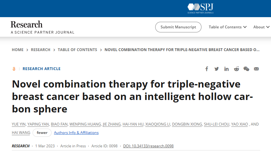 该成果以“Novel combination therapy for triple-negative breast cancer based on an intelligent hollow carbon sphere”为题发表在国际权威期刊《Research》上,IF:11.036,中科院期刊分区表1区。金沙官网