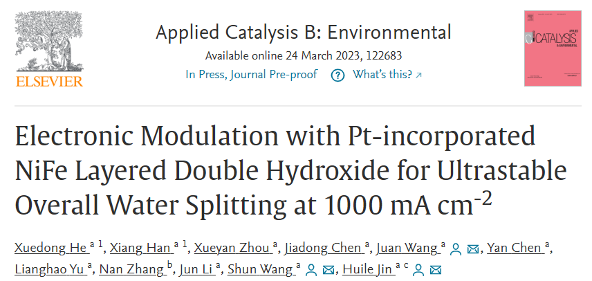 这一研究结果以“Electronic Modulation with Pt-incorporated NiFe Layered Double Hydroxide for Ultrastable Overall Water Splitting at 1000 mA cm-2”发表在国际期刊《Applied Catalysis B: Environmental》(IF=24.319),温州大学为第一通讯单位,我校金沙官网