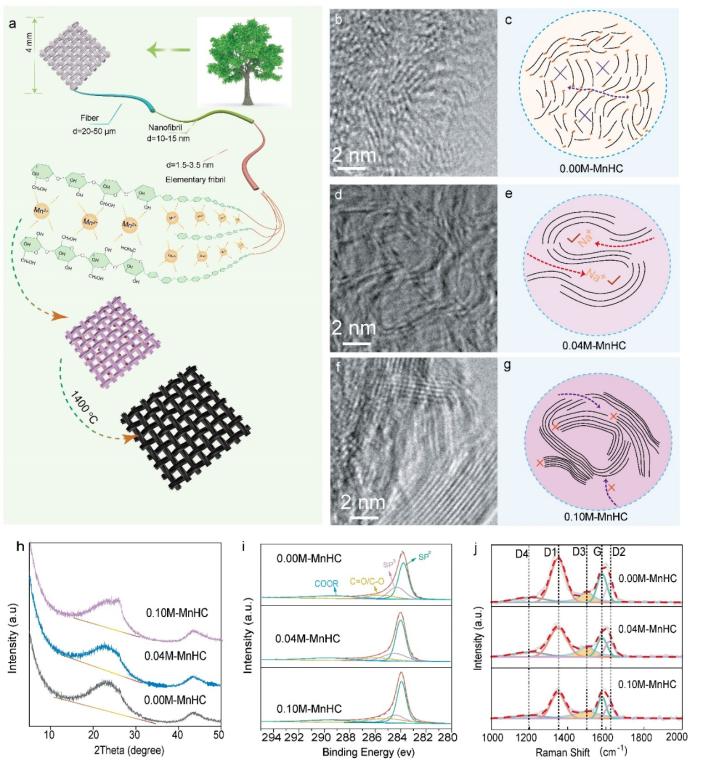图1a)锰离子和硬碳前体之间的配位过程的示意图。由不同锰盐浓度调节的硬碳的HRTEM图像和结构图,b,c) 0.00M-MnHC,d,e) 0.04M-MnHC,和f,g) 0.10M-MnHC。h) X射线衍射(XRD),i) X射线光电子能谱(XPS) C1s光谱,以及j) 0.00M-MnHC,0.04M-MnHC和0.10M-MnHC的解卷积拉曼光谱比较。