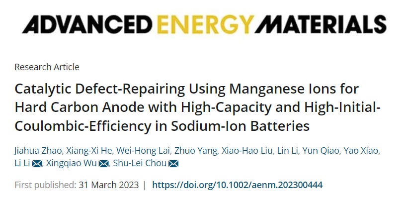 该研究以“Catalytic Defect-Repairing Using Manganese Ions for Hard Carbon Anode with High-Capacity and High-Initial-Coulombic-Efficiency in Sodium-Ion Batteries”为题发表在材料领域国际顶级期刊《Advanced Energy Materials》。金沙官网