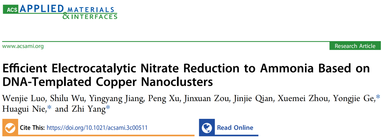 相关研究成果以《Efficient Electrocatalytic Nitrate Reduction to Ammonia Based on DNA-Templated Copper Nanoclusters》为题发表在国际著名期刊《ACS Applied Materials& Interfaces》(IF:10.383)上,温州大学为第一单位,我院2020级研究生罗文杰为第一作者,金沙官网