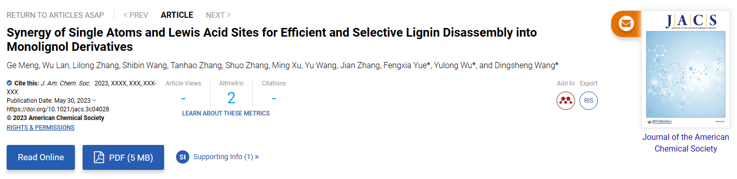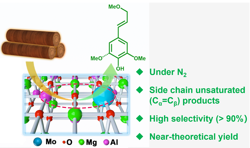 基于以上分析,我院孟格博士与清华大学王定胜教授、吴玉龙教授以及华南理工大学岳凤霞教授课题组合作,通过基于层状双金属氢氧化物(LDHs)的阴离子插层和二维(2D)限域策略设计合成了一种以MgO为载体且同时负载Mo单原子和Al Lewis酸性位点的多功能催化剂(Mo1Al/MgO),并将其应用在N2气氛下的桉木木质素解聚反应当中。Mo1Al/MgO催化剂对松柏醇γ甲醚和芥子醇γ甲醚的选择性达到92%,同时具有良好的循环稳定性。密度泛函理论(DFT)计算和对照实验进一步表明,在甲醇参与条件下,Mo1-O5单原子中心与邻近的Al Lewis酸位点的协同催化作用使侧链不饱和单体产物的产率和选择性大幅提高。该研究将单原子和Lewis酸位点结合起来,在更安全和更低成本的生物质催化体系中获得高附加值产品,并为生物质炼制工业的催化剂设计提供了一定的理论指导。这一成果近期发表在Journal of the American Chemical Society (DOI: 10.1021/jacs.3c04028),孟格博士为第一作者,温州大学为第一完成单位,岳凤霞、吴玉龙、王定胜为共同通讯作者。