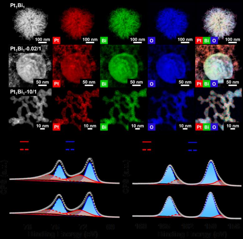 胡悦特聘教授团队联合北京理工大学杜然教授、普渡大学王进莹博士在MAs形貌调控方面取得新进展,同时对MAs的光电催化性能进行深入研究。相关成果以标题“Leveraging Ligand and Composition Effects: Morphology-Tailorable Pt-Bi Bimetallic Aerogels for Enhanced (Photo-)Electrocatalysis”(DOI:10.1002/smll.202301288)发表在Small上。在该工作中,通过协调配体和组成效应,成功制备了以0D纳米粒子、1D核壳纳米线、2D纳米片和3D微球为NBBs构筑的金属气凝胶,扩展了MAs的结构多样性。以甲醇氧化反应为模型反应,通过调整Pt-Bi气凝胶的形貌与光学特性,在300 mW·cm-2紫外线照射下,气凝胶的催化电流密度高达11.98 A·mgPt-1,比光照下的商业Pt/C高6.4倍,优于所有已报道的基于MAs的MOR电催化剂。本研究不仅为原位制备NBBs可调控的MAs提供了新的途径,而且为高性能MAs基电催化剂和光电催化剂的制备提供了新的角度。金沙官网
