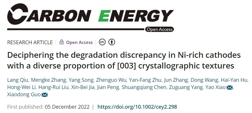 该成果以“Deciphering the degradation discrepancy in Ni-rich cathodes with the diverse proportion of [003] crystallographic texture”为题发表在高水平权威期刊Carbon Energy(IF: 21.556)上。我校肖遥瓯江特聘教授与四川大学郭孝东教授为该论文共同通讯作者。