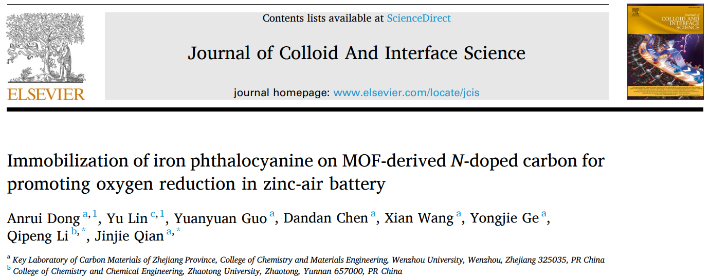 这项研究的成果题为《Immobilization of iron phthalocyanine on MOF-derived N-doped carbon for promoting oxygen reduction in zinc-air battery》,发表在《Journal of Colloid and Interface Science》(中科院1区,Top,IF=9.965)上。温州大学为第一通讯单位,金沙官网