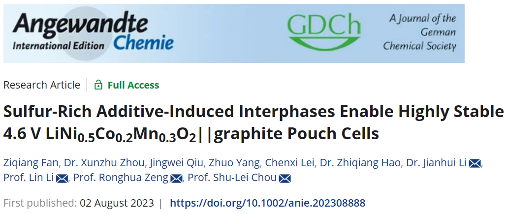 碳中和技术创新研究院李林团队联合华南师范大学曾荣华教授、李键辉博士在国际权威期刊Angewandte Chemie International Edition上发表题为《Sulfur-Rich Additive-Induced Interphases Enable Highly Stable 4.6 V LiNi0.5Co0.2Mn0.3O2||graphite Pouch Cells》的学术论文。本论文通过在4.6 V LiNi0.5Co0.2Mn0.3O2(NCM523)||石墨软包电池中引入含硫量为34.04%的超高含硫量添加剂(甲烷二磺酸亚甲酯,MMDS),从而构建了一种由添加剂诱导形成的稳固富硫电极-电解液面相。在4.6 V高电压条件下,循环800次,含MMDS添加剂的NCM523||石墨软包电池仍具有87.99%的高容量保持率以及更好的倍率性能,且与较低硫含量的一系列添加剂做对比,突出了高含硫量添加剂MMDS的优势。结合实验表征以及理论计算,进一步探究了MMDS添加剂在溶剂中的优先氧化还原性,从而证明它能够优先在正负极上界面构筑稳定的富硫电极-电解液界面膜,该界面相的存在成功稳定了高电压NCM523||石墨软包电池,显著提高了电池的循环稳定性。同时实验结果也表明MMDS分解所构筑的富硫界面相在抑制电解液消耗、产气以及稳定电极材料、减少过渡金属溶出上有着非常好的效果。金沙官网相关的文章发表在Angewandte Chemie International Edition上,温州大学为第一通讯单位,金沙官网