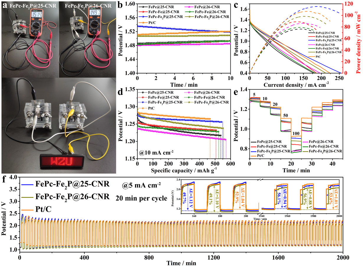 图3. 由FePc-Fe2P@25/26-CNR催化剂为阴极材料组装而成的锌空电池的实际应用与放电性能研究。