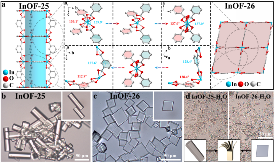 要点一:铟离子与间苯二甲酸配体受到溶剂诱导效应合成了配位取向截然不同的两种In-CPs(InOF-25和InOF-26)。两者可在互换溶剂的条件下完成晶体溶解到析出的可逆转变过程,并均可在水溶液中转化成相同结构的条形晶体(InOF-25-H2O和InOF-26-H2O)。