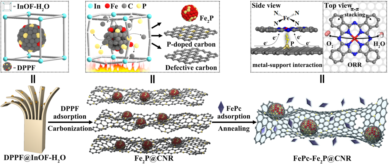 为了提高燃料电池的整体效率,合理设计和制备成本效益高、催化活性高、稳定性好的非贵金属电催化剂对实际应用具有至关重要的意义。金属大环分子酞菁铁(FePc)由于其可调节的d轨道过渡金属和对称共轭环结构,具有作为氧还原(ORR)活性位点的潜力。同时调整活性物质与载体之间的相互作用可以防止负载颗粒的团聚,并促进电子转移和增加纳米材料的稳定性。因此,选择结构可调和形态可修饰的配位聚合物(CPs)来制造理想的碳载体来锚定活性物质是设计先进电催化剂的一种有前途的策略。