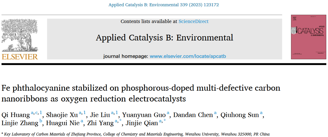 Qi Huang, Shaojie Xu, Jie Liu, Yuanyuan Guo, Dandan Chen, Qiuhong Sun, Linjie Zhang, Huagui Nie, Zhi Yang and Jinjie Qian. Fe phthalocyanine stabilized on phosphorous-doped multi-defective carbon nanoribbons as oxygen reduction electrocatalysts. Appl. Catal. B-Environ., 2023, 339, 123172.