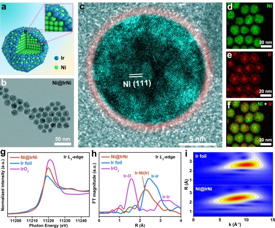 氢能是一种理想的清洁新能源,具有多用途、高能量密度和零排放等优点。在电化学反应中,氢的利用和生产通常通过两种基本反应实现,即氢氧化/析氢反应(HOR/HER)。前者主要发生在燃料电池的阳极上,将化学能转化为电能,而后者是电解水将电能转化为化学能的核心过程之一。碱性燃料电池和水电解槽比酸性条件下更具成本效益优势和商业化潜力。目前,Pt及其合金是电催化HOR/HER的常见的商业催化剂,但是,在碱性条件下,这些贵金属的催化活性比酸性条件下要低2-3个数量级。因此,开发出高活性的HOR/HER电催化剂是实现碱性燃料电池及电解水商业化的关键因素之一。在寻找合适的HOR/HER电催化剂时,需要同时考虑优化氢结合能(HBE)和羟基结合能(OHBE),值得注意的是,金属Ir是一种很有希望的候选物,但是在碱性电催化 HOR中,单质Ir表现出比Pt更低的活性,而且由于表面氧化,它在超过0.4 V的电位区间后就显著失活。另外,金属Ni作为常见的电催化HOR非贵金属,也成为我们开发低成本碱性HOR催化剂的潜在者,我们预计其与金属Ir结合,可以增强OHBE,从而加速碱性溶液中的电催化HOR/HER。