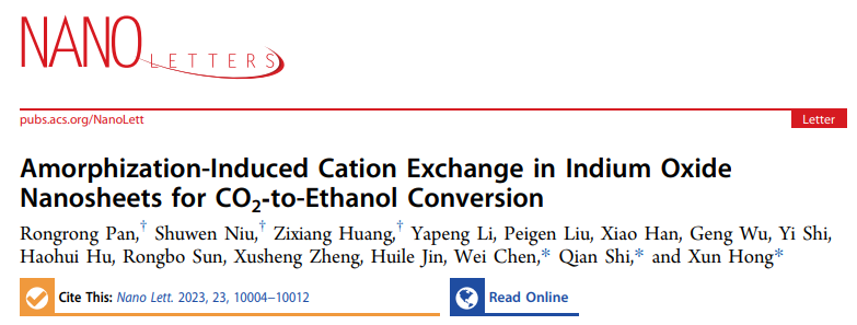 陈伟、时茜教授课题组和中国科学技术大学洪勋教授课题组在国际知名期刊《Nano Letters》发表题为“Amorphization-induced cation exchange in indium oxide nanosheets for CO2-to-ethanol conversion”的论文。该工作在理论计算的指导下,以无定形In2O3纳米片(a-In2O3 NSs)为主体材料,在室温下与多种客体阳离子进行CE反应。密度泛函理论(DFT)计算表明,无定形纳米材料中丰富的配位-不饱和金属位点对于突破CE反应的能垒以调控金属氧化物的组成至关重要。