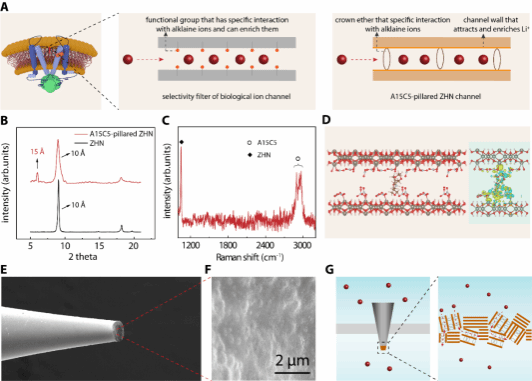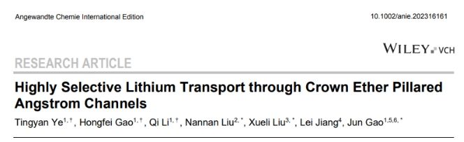 刘楠楠特聘教授课题组构筑了埃级尺寸的冠醚柱撑通道,即1-氮杂-15-冠-5插层的碱式硝酸锌(A15C5-pillared ZHN),将以上效应集成到材料中,实现了高选择性锂离子传输。其中,通道的埃级尺寸可以排斥双价离子,而冠醚对碱金属离子有特异性识别功能,可以促进锂的传输,阻碍钠的传输,另外,所构筑的通道与锂离子相互作用强,可以高效富集锂离子,最高可将锂离子电导提升多个数量级。为了评估材料提锂的潜力,刘楠楠特聘教授团队制备了含不同浓度LiCl (25 μM至0.5 M)和固定浓度NaCl(0.5 M)的二元离子混合物,将提锂装置置于离子混合物和超纯水之间,使离子沿浓度梯度扩散(图2F)。在锂离子浓度与海水中相近(25 μM)时,材料可以放大锂离子电导,有效Li+/Na+选择性高达1422。这些结果表明离子富集对提高Li+选择性的重要性。上述成果以“Highly Selective Lithium Transport through Crown Ether Pillared Angstrom Selective Lithium Transport through Crown Ether Pillared Angstrom Channels”为题发表在国际顶级期刊《Angew. Chem. Int. Ed.》上。