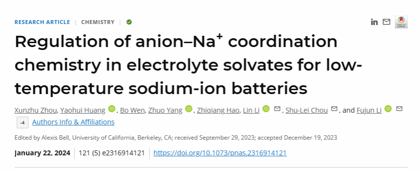 碳中和技术创新研究院李林团队联合南开大学李福军教授在国际权威期刊Proceedings of the National Academy of Sciences of the United States of America上发表题为“Regulation of Anion-Na+ Coordination Chemistry in Electrolyte Solvates for Low Temperature Sodium-Ion Batteries”的学术论文。文中选用高电子亲和能力的阴离子三氟乙酸根(TFA-)调控1.0 M NaPF6-G2电解液中的溶剂化学。该全氟阴离子的DN值高达34.0 kcal mol-1,其强配位作用使其全部参与内溶剂化鞘层,实现常规浓度下更多阴离子占据的溶剂化构型。与1.0 M NaPF6-G2电解液相比,增强的TFA-和降低的G2配位的溶剂化化学加速了界面Na+去溶剂化行为,呈现出较低的去溶剂化能(40至-20 ℃:3.49 vs. 4.16 kJ mol-1;-20至-60 ℃:16.55 vs. 24.74 kJ mol-1)。可诱导均匀稳定的Na沉积,实现25 ℃下500圈99.9%的超高超稳定的库仑效率。同时,Na||Na3V2(PO4)3电池在-40 ℃下循环呈现出60.2%的室温容量和100圈后99.2%的高容量保持率。这项工作为溶剂化化学调控助力高性能低温钠离子电池发展提供了新的见解。金沙官网