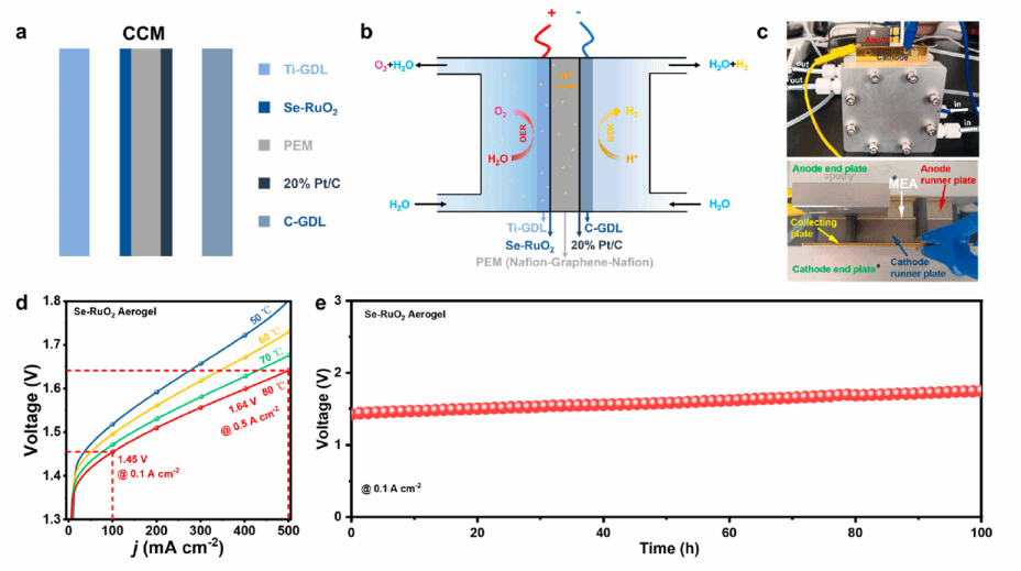 在80°C的工作温度下,以Se-RuO2 aerogel作为阳极材料的聚合物电解质膜水电解池表现出了优异的性能,在1.45 V和1.64 V的极低电压下分别实现了100和500 mA cm-2的电流密度。同时,Se-RuO2 aerogel表现出优异的稳定性,在连续100小时测试过程中性能的衰减可以忽略不计,证明了Se-RuO2 aerogel在未来工业应用中的巨大潜力。