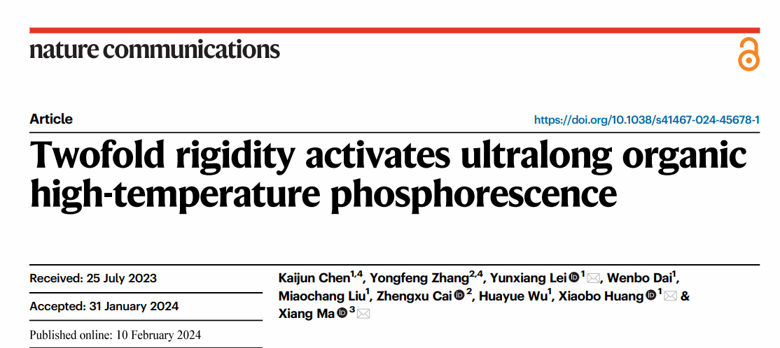 黄小波教授/雷云祥特聘教授联合华东理工大学马骧教授在国际顶级期刊《Nature communications》上发表题为《Twofold Rigidity Activates Ultralong Organic High-Temperature Phosphorescence 》的学术论文。该工作选择具有几乎完全平面结构的刚性分子9H-二苯并[a,c]咔唑(BCZ)作为客体分子,平面结构可以使分子的振动和旋转最小化。此外,刚性结构有利于增加磷光寿命,延长余辉时间。选择具有刚性结构和高玻璃化转变温度的聚乙烯吡咯烷酮(PVP)作为主体基质,进一步抑制客体的分子运动。这种双重刚性导致掺杂材料BCZ/PVP在293 K下表现出40 s的超长余辉,在373 K下表现出长达20 s的强余辉,在413 K下表现出约6 s的明亮余辉,甚至在433 K下表现出1 s的清晰余辉,表现出优异的HTP性能。此外,将旋转能力从弱到强的甲基、正丁基、苄基、苯基和三苯胺基进一步连接到BCZ分子上,制备了5个对照客体(BCZ-Me、BCZ-nBu、BCZ-Be、BCZ-Ph和BCZ-TPA)。烷基(如甲基或正丁基)对分子激发态能的影响相对较小,因此BCZ-Me/PVP和BCZ-nBu /PVP掺杂材料表现出与BCZ/PVP几乎相同的HTP性能。从BCZ-Be到BCZ-TPA,随着基团旋转能力的增加,相应掺杂材料的HTP性能逐渐下降,符合逻辑和预期的趋势。实验结果和理论计算表明,刚性平面结构可以抵抗高温下的分子热运动。此外,主体基质在高温下提供的刚性环境是影响材料HTP性能的重要因素。进一步选择聚乙烯醇(PVA)和聚己二酰己二胺(PA66)作为主体基质。虽然所有掺杂材料均表现出优异的RTP性能,但由于PVA和PA66的玻璃化转变温度值低于PVP,以PVA或PA66为主体的掺杂材料的HTP性能弱于以PVP为主体的掺杂材料。最后,以其他四种平面分子为客体的掺杂材料也表现出优异的HTP性能,表明双刚性策略具有良好的通用性。本研究提出了构建HTP材料的策略,将促进有机磷光材料的发展。