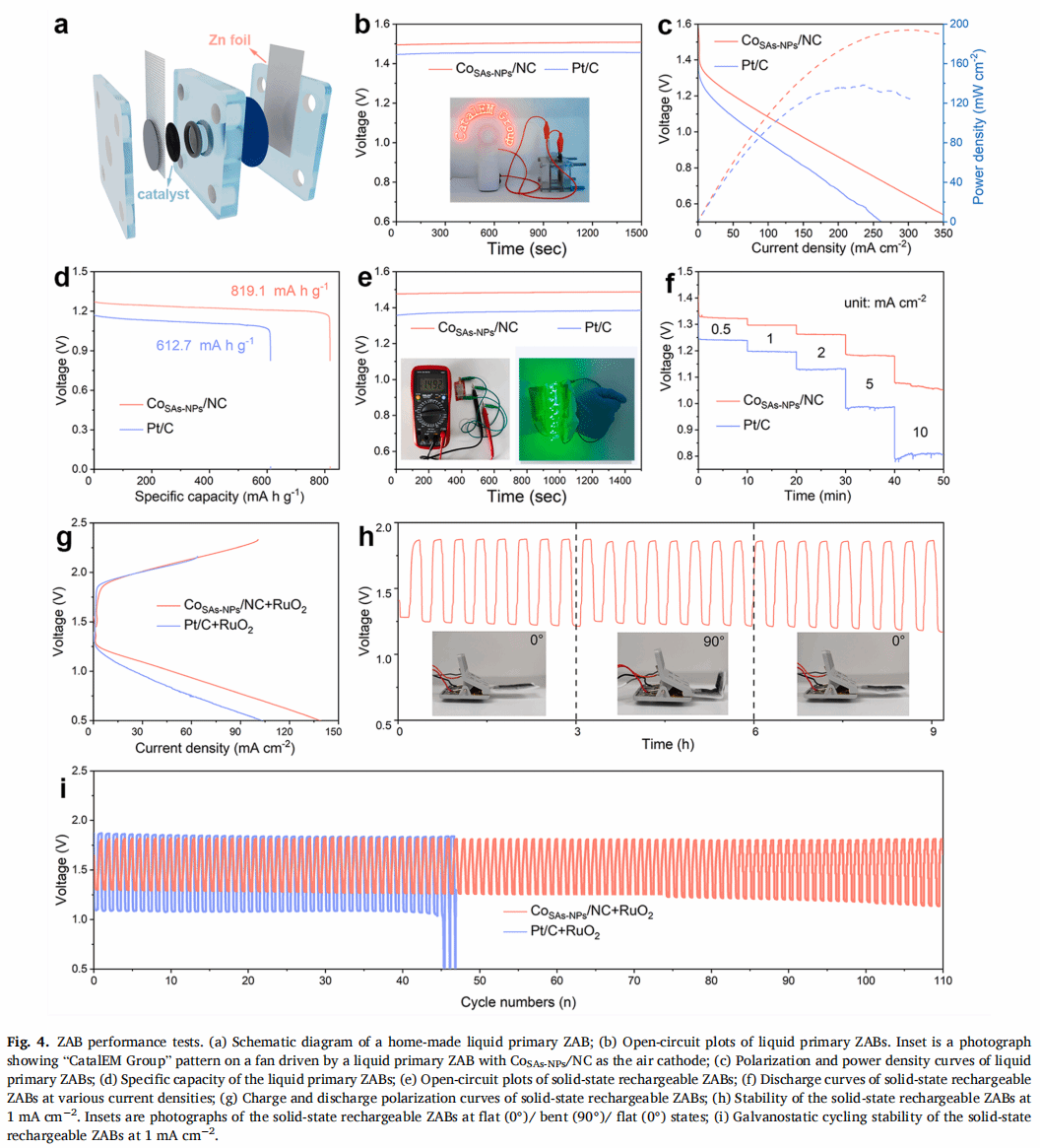 我们将CoSAs-NPs/NC催化剂作为空气阴极,分别装配在一次锌空电池和二次柔性锌空电池上,测试其在实际应用中的电池性能。相较于商业Pt/C,这种催化剂组装的电池表现出更大的开路电压、峰值功率密度和超高的比容量(819.1 mA h g−1),并在实际的二次柔性电池中展现出优异的充放电稳定性(Figure 2)。