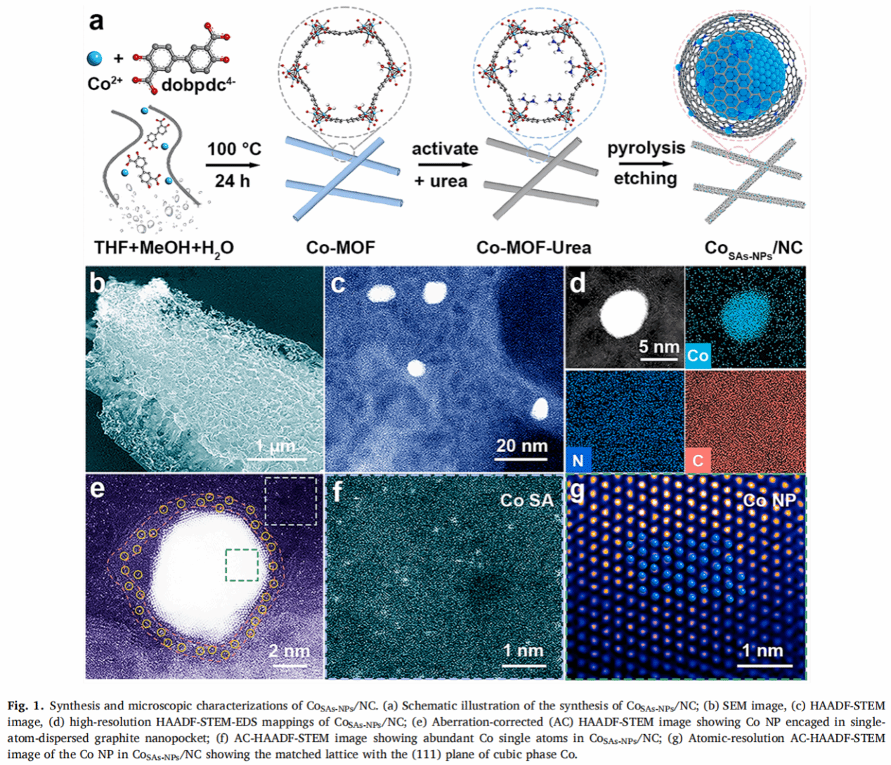 钱金杰课题组通过逐步合成策略,对Co-MOF的内部Co金属位点配位环境调控,成功实现了客体尿素分子(urea)的配位掺杂(Co-MOF-Urea)。随后,我们将其热解碳化,再经酸刻蚀处理,最终获得了一种将Co纳米颗粒(Co NPs)嵌入在Co‒N4原子分散(Co SAs)的石墨“纳米口袋”氧还原催化剂(CoNPs-SAs/NC, Figure 1)。基于该特殊的构效关系,所制备的氧还原催化剂不仅能充分发挥Co纳米颗粒与Co单原子之间的协同催化作用,而且表现出优异的催化活性和稳定性。同时,在实际的二次柔性锌空电池中,该催化剂展现出了卓越的电池性能。本研究为合理设计和制备基于MOF衍生的碳纳米材料电催化剂提供有效的新思路。