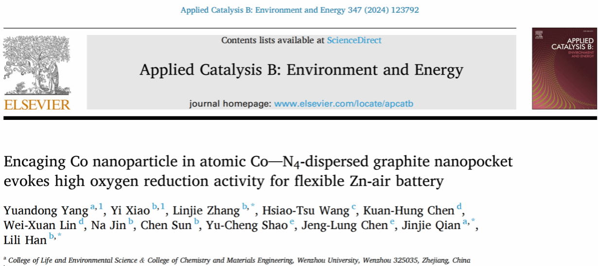 Yuandong Yanga,#, Yi Xiaob,#, Linjie Zhangb,*, Hsiao-Tsu Wangc, Kuan-Hung Chend, Wei-Xuan Lind, Na Jinb, Chen Sunb, Yu-Cheng Shaoe, Jeng-Lung Chene, Jinjie Qiana,*, and Lili Hanb,*. Encaging Co nanoparticle in atomic Co‒N4-dispersed graphite nanopocket evokes high oxygen reduction activity for flexible Zn-air battery. Applied Catalysis B: Environment and Energy, 2024, 347, 123792.