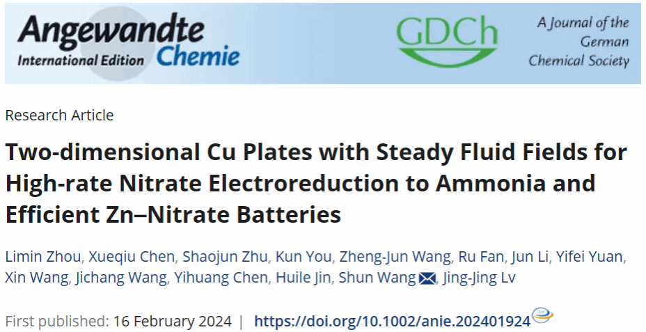 该成果以“Two-dimensional Cu Plates with Steady Fluid Fields for High-rate Nitrate Electroreduction to Ammonia and Efficient Zn–Nitrate Batteries”为题发表在Angewandte Chemie International Edition期刊(IF=16.6,SCI一区)上。温州大学为第一通讯单位,金沙官网