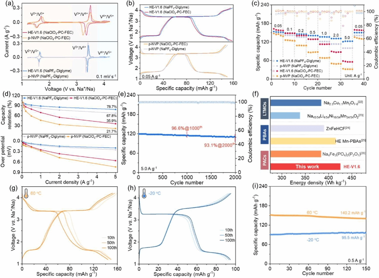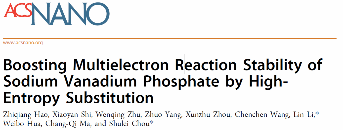 碳中和技术创新研究院李林团队在国际权威期刊ACS Nano上发表题为“Boosting Multielectron Reaction Stability of Sodium Vanadium Phosphate by High Entropy Substitution”的学术论文。本文提出了一种结合高熵取代和电解液优化的策略来促进NVP的可逆多电子反应。通过原位X射线吸收近边结构光谱和原位X射线衍射,揭示了V5+/V4+氧化还原对的高可逆性和可逆晶体结构演变。同时,通过使用醚类电解液可以进一步提升高熵取代NVP(HE-NVP)的电化学反应动力学。这使得HE-NVP表现出优越的电化学性能(2000次循环后容量率为93.1%)。即使在5.0 A g−1时,可逆容量也为120 mAh g−1)。此外,HE-NVP||天然石墨全电池液展现出长循环寿命和高功率密度。结果表明,高熵取代和电解液优化的协同是提高聚阴离子正极钠存储性能的有力策略。金沙官网