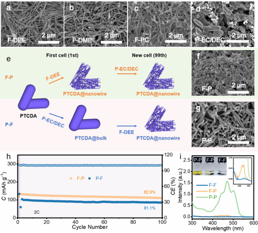 图1. 在(a)F-DEE、(b)F-DME、(c)F-PC和(d)P-EC/DEC电解液中,PTCDA电极循环后的SEM图像;(e)交换电解液实验示意图;(f-g)经过交换电解液实验后,PTCDA电极的SEM图像;(h)在交换电解液实验中,PTCDA电极的循环性能;(i)PTCDA-P电极和PTCDA-F的溶解行为