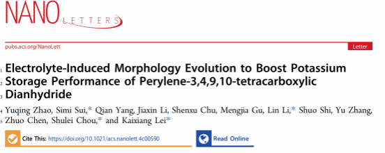 碳中和技术创新研究院李林团队联合河北工业大学雷凯翔副教授在国际权威期刊Nano Letters上发表题为“Electrolyte-Induced Morphology Evolution to Boost Potassium Storage Performance of Perylene-3,4,9,10-tetracarboxylic Dianhydride”的学术论文。文中提出了一种用于有机材料的弱溶剂化电解液,并揭示了电解液对电化学性能的影响机理。电解液不仅表现出较低的溶解能力,而且在充放电过程中诱导了PTCDA的形貌演变。独特的纳米线形貌提高了电化学反应动力学,抑制了PTCDA的溶解。在2000次循环后实现89.1%的高容量保持率。同时,石墨||PTCDA全电池具有卓越的循环稳定性能,展现出强大的实际应用潜力。这项工作提出了一种新颖的解决有机物高溶解问题的思路,为电极材料形貌演变的研究提供了理论基础。金沙官网