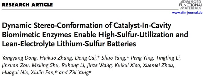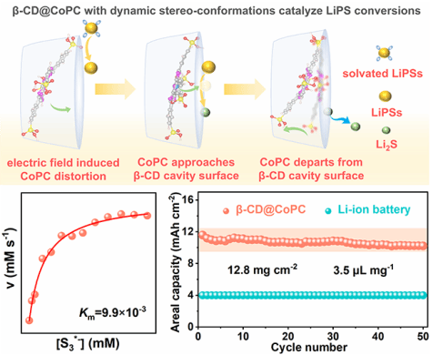 杨植教授团队联合浙江大学的范修林教授,在国际知名期刊Advanced Function Materials上发表题为“Dynamic stereo-conformation of catalyst-in-cavity biomimetic enzymes enable high-sulfur-utilization and lean-electrolyte lithium-sulfur batteries”的文章。该工作,受启发于天然酶结构中各组分的协同作用,巧妙将磺化钴酞菁(CoPC)催化中心植入β-环糊精(β-CD)腔中,在硫正极中高精度地构筑了仿生酶催化剂(β-CD@CoPC)。这种多功能的β-CD@CoPC催化剂显著提高了贫电解质锂硫电池的硫氧化还原活性,同时加速了放电产物Li2S在催化剂表面的解离。结果表明,具有β-CD@CoP仿生催化剂的Li−S软包电池实现了优异的电化学性能。通过多种半原位/原位实验手段系统地确定了电化学性能改进的根源。更重要的是,通过拟合米氏方程确定了米凯利斯常数(Km)是锂硫电池仿生酶催化活性的关键描述符,有助于快速、高效地筛选Li-S电池催化剂。