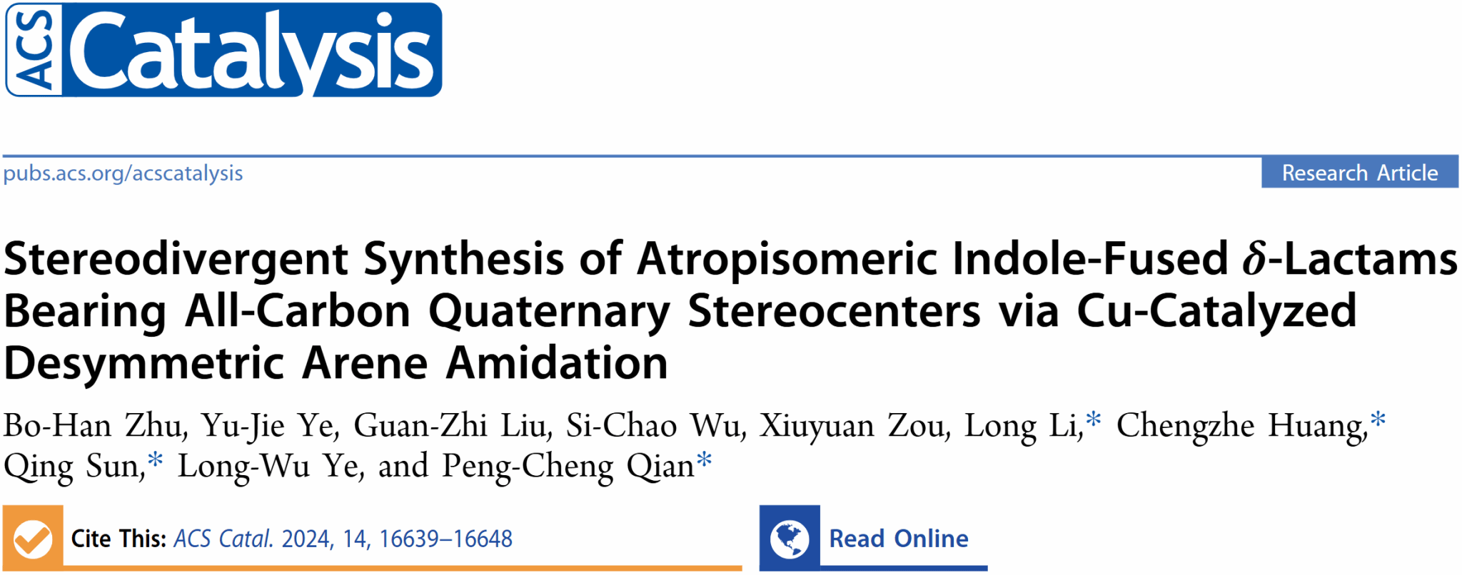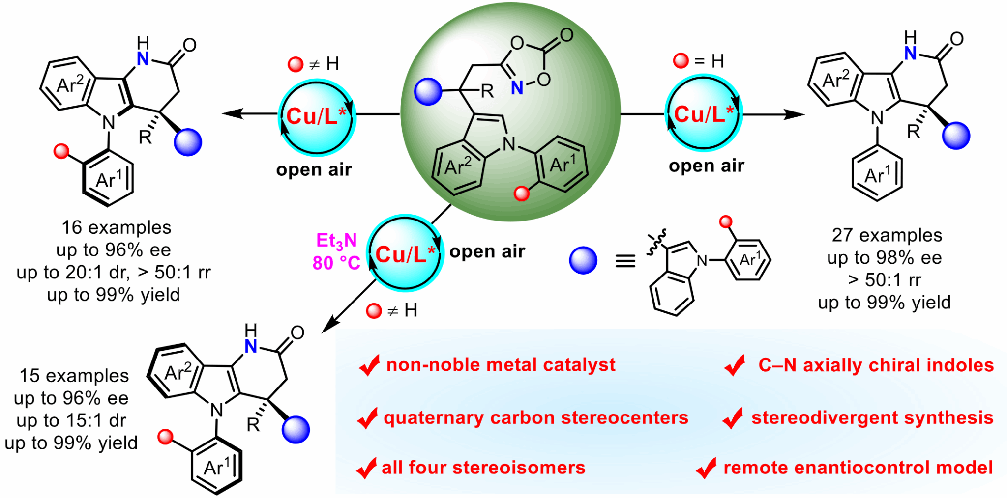 钱鹏程-李龙教授课题组开发了一类铜催化的酰基氮宾迁移不对称芳烃δ-内酰胺化反应,构建了具有全碳立体中心和 C-N 轴手性的吲哚并δ-内酰胺化合物,具有良好的产率、立体选择性和区域选择性,底物范围广。通过手性配体与有机碱的结合使用,即可轻松实现包含全碳立体中心和 C-N 轴手性的δ-内酰胺所有四种立体异构体的合成。此外,该反应可能经历了铜催化的单线态氮转移/重排和远程对映体控制过程,得到了控制实验和理论计算的大力支持。