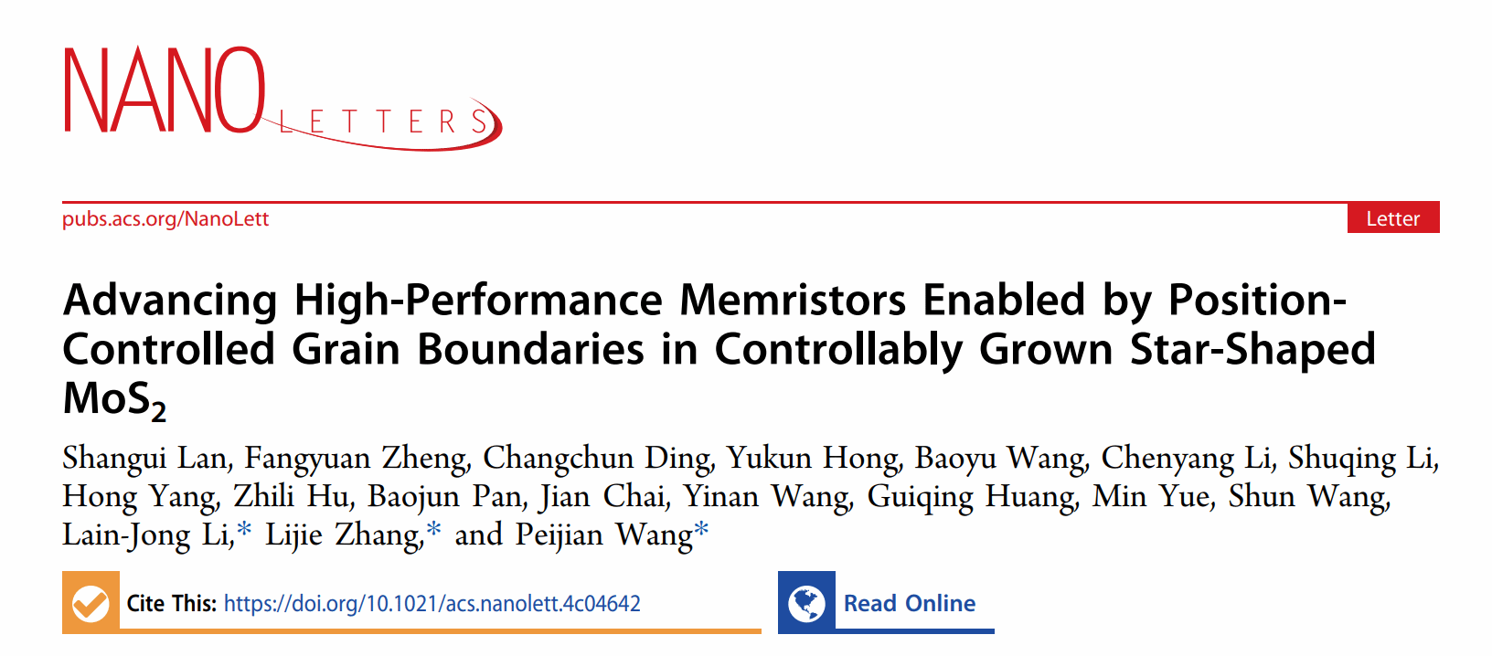 该工作以“Advancing High-Performance Memristors Enabled by Position-Controlled Grain Boundaries in Controllably Grown Star-Shaped MoS2”为题发表在国际纳米顶尖期刊《Nano Letters》上。温州大学为第一通讯单位,金沙官网