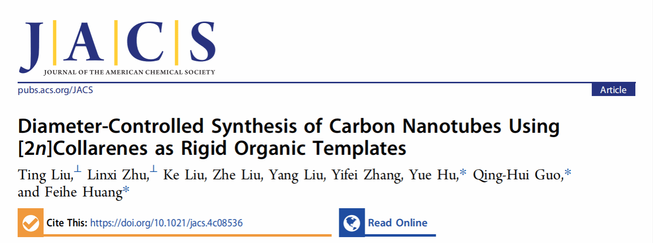 单壁碳纳米管(SWCNTs)因其卓越的理化性质而备受关注。碳纳米管的直径对其性质有着重要影响。因此,直径可控地合成SWCNTs对其实际应用至关重要。利用有机分子为模板实现SWCNTs的生长具有重要价值。首先,其结构明确,有利于SWCNTs的直径可控生长。其次,有机模板避免了金属污染问题。在过去十年中,使用有机模板(如CPP和曲面多环芳烃)生长SWCNTs取得了巨大的进展。然而,高效生长窄直径分布的SWCNTs仍然面临挑战。其中最大的阻碍是缺乏合适的模板分子。分子碳纳米带做为碳纳米管的最小重复单元,其刚性结构为SWCNT生长提供精准模板,有利于SWCNT直径可控制备,因此在碳纳米管生长领域引起了广泛关注。然而迄今为止,利用分子碳纳米带为模板实现SWCNTs的直径可控生长仍未被报道。近日,温州大学胡悦特聘教授、清华大学郭庆辉副教授、浙江大学黄飞鹤教授合作在该领域实现了突破。