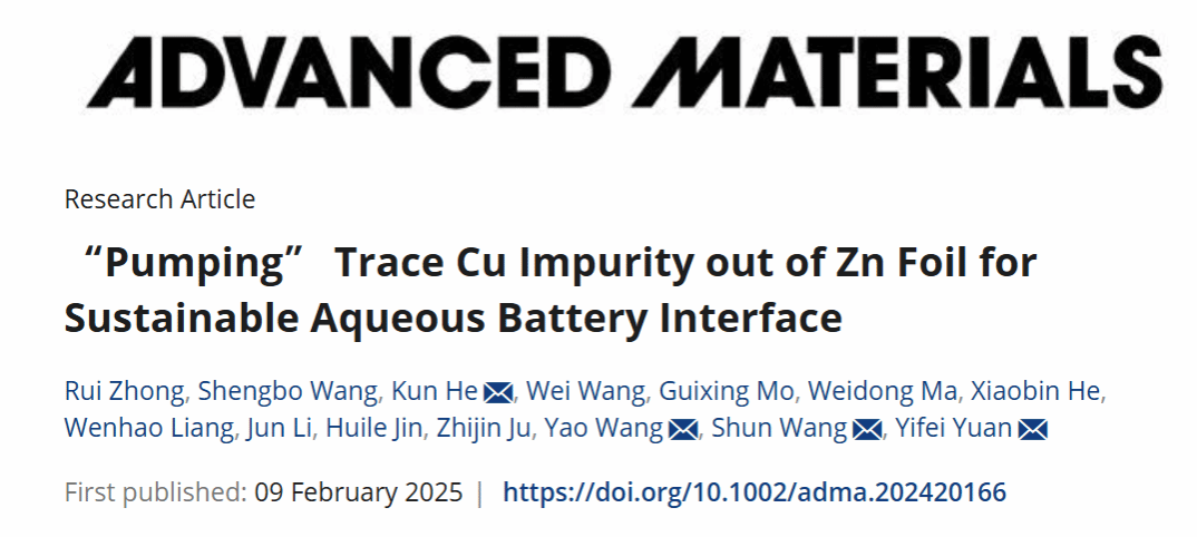 相关研究成果以“‘Pumping’ Trace Cu Impurity out of Zn Foil for Sustainable Aqueous Battery Interface”为题发表在国际顶级期刊《Advanced Materials》。我校为第一通讯单位,我校金沙官网