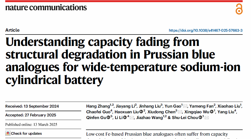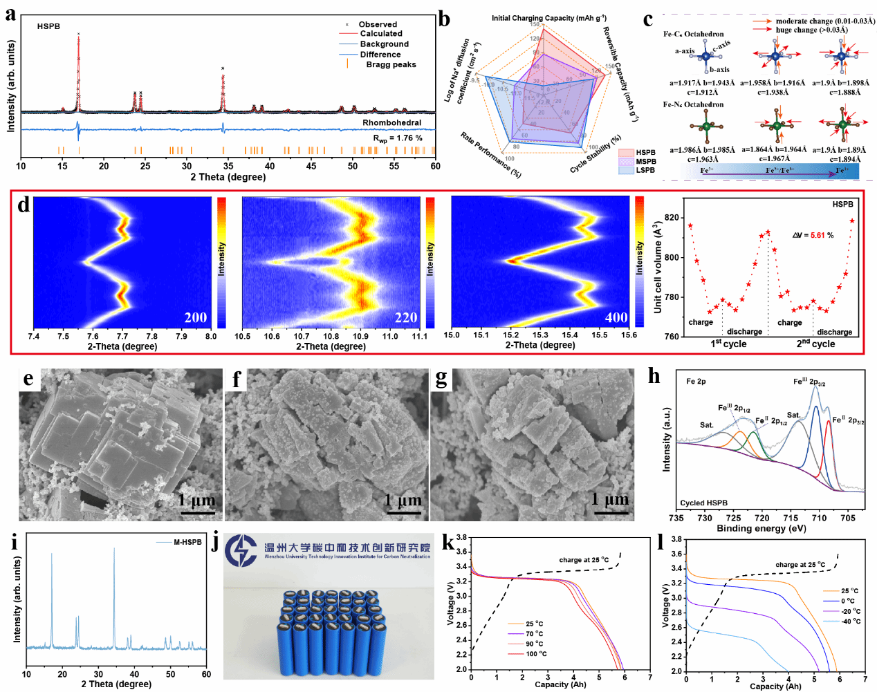 近日,我校侴术雷教授团队系统的揭示了PBAs在循环过程中发生容量衰减的多尺度机制:不可逆相变、晶格畸变引发破坏性结构退化、电极表面活性位点损失与过渡金属溶出。基于此,提出配位环境调控-晶核生长优化的双重策略,显著提升了PBAs的结构稳定性。采用改性PBAs正极与硬碳负极组装的18650/33140圆柱电池,在1000次循环后仍保持80%的容量与能量保持率,并实现在-40℃至100℃宽温域内稳定工作。该成果不仅明晰了PBAs容量衰减的争议性机理,更验证了其在长寿命、宽温区钠离子电池中的商业化应用前景。