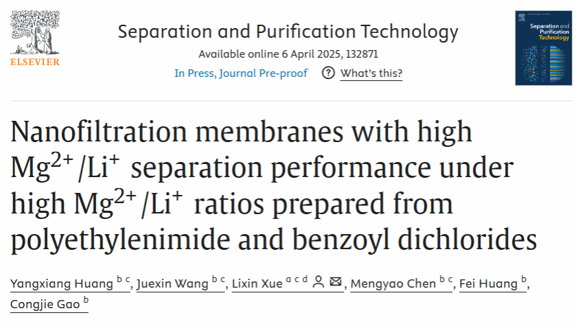 文章链接:“Nanofiltration membranes with high Mg2+/Li+ separation performance under high Mg2+/Li+ ratios prepared from polyethylenimide and benzoyl dichlorides” //doi.org/10.1016/j.seppur.2025.132871